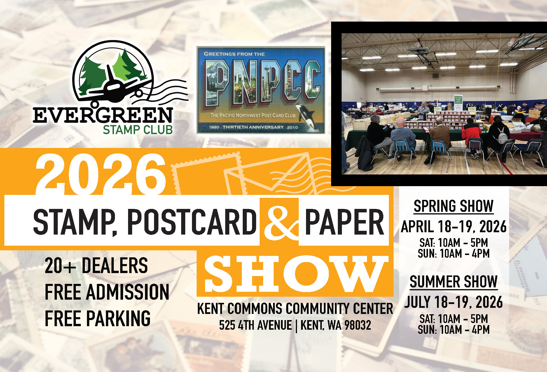 Spring Stamp, Postcard & Paper Show: Spring - April 18, 2026, 10:00 a.m. to 5:00 p.m. & Sunday April 19, 2026, 10:00 a.m. to 4:00 p.m. at the Kent Commons with 20+ dealer tables.